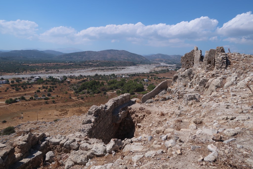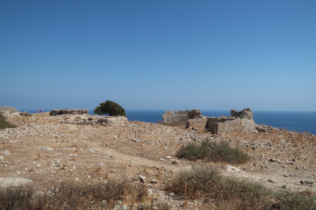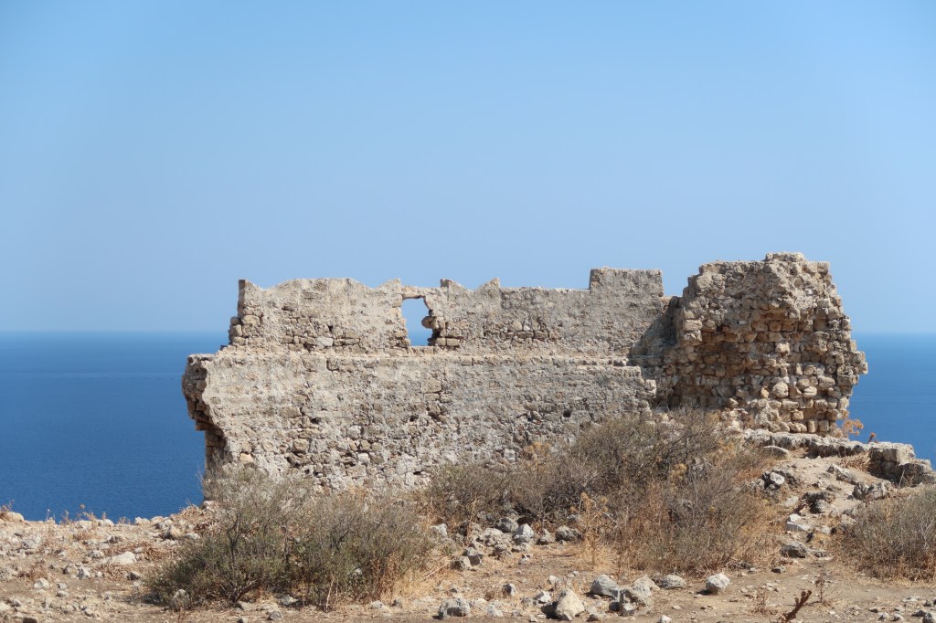 The castle is on top of the hill over looking at the Aegean Sea and the Charaki village.